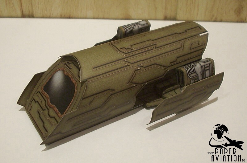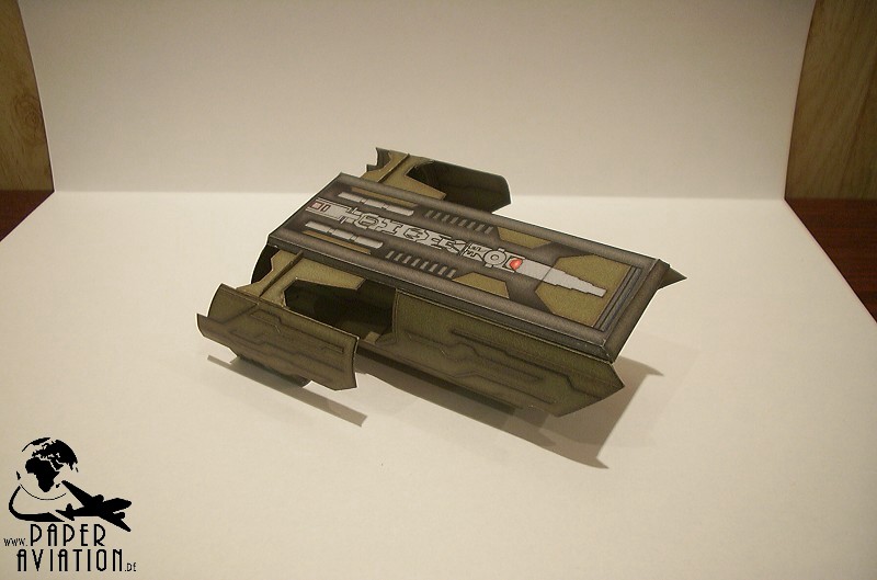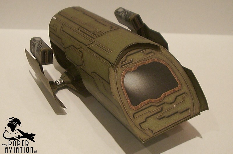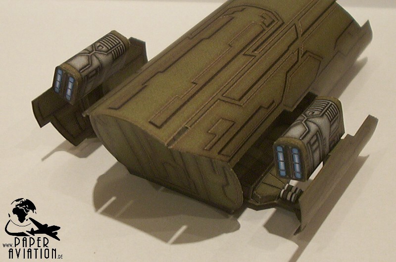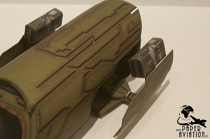 Dieses Modell ist wieder als Give-Away für die SpaceDays 2006 in Darmstadt entstanden. Größte Schwierigkeit bei diesem Projekt war das mühsame Suchen von Vorbildinformationen, außer einigen Fotos ist nicht viel zu finden. Pläne, Größenangaben oder Zeichnungen fanden sich überhaupt nicht. Letztlich musste ich das Modell rein nach Bildern aus der Serie entwickeln. Die Größe der Schauspieler und bekannter Gegenstände diente als Ausgangspunkt für die Bestimmung der Jumper-Dimensionen. Zeitaufwendig war ebenfalls die Wiedergabe der Oberflächenstruktur. Mittlerweile muss man ergänzen, dass mein Kartonmodell den Puddle Jumper aus der 1.Staffel der TV-Serie darstellt. Denn wenn man sich einige Screenshots aus der 2.Staffel ansieht, bemerkt man, dass die Produzenten eine neue Film-Requisite bauen ließen. Diese unterscheidet sich doch erheblich von der ersten.